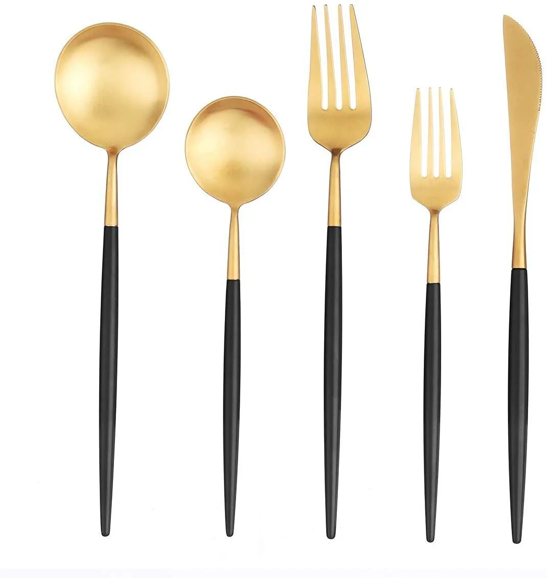 Image 1 of 3 Image 2 of 3 Image 3 of 3 Black/gold Flatware $1.00 $1/ utensil Size: Dinner knife Dinner fork Salad fork Tea spoon Quantity: Add To Cart Added! $1/ utensil